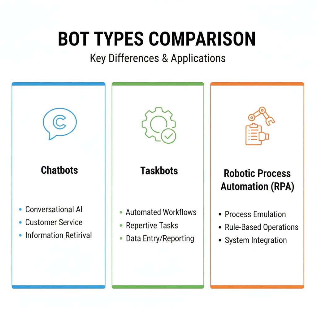 - Chatbot: najczęściej bot działający w oknie czatu, odpowiadający na pytania lub realizujący zadania.