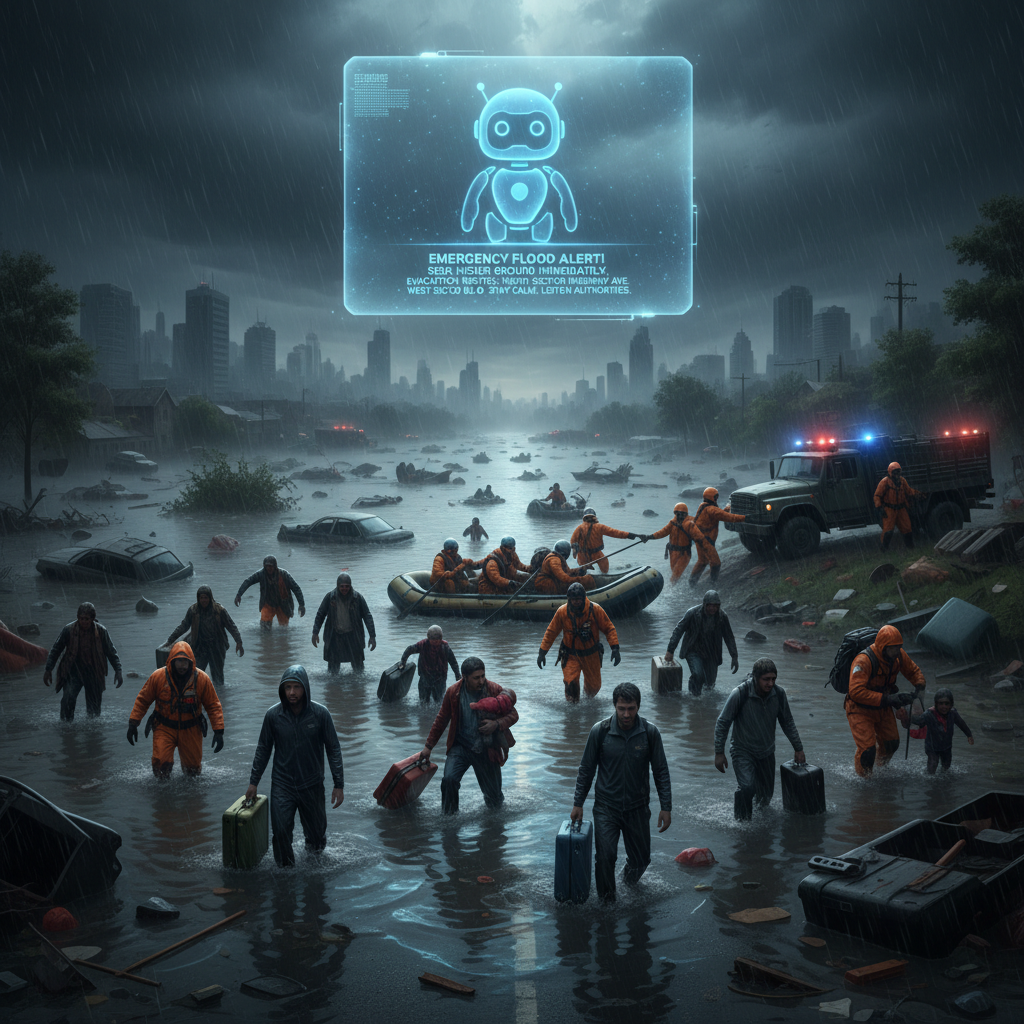 Na zdjęciu ewakuacja mieszkańców z powodu powodzi, z wyraźnie widocznym powiadomieniem z bota pogodowego.