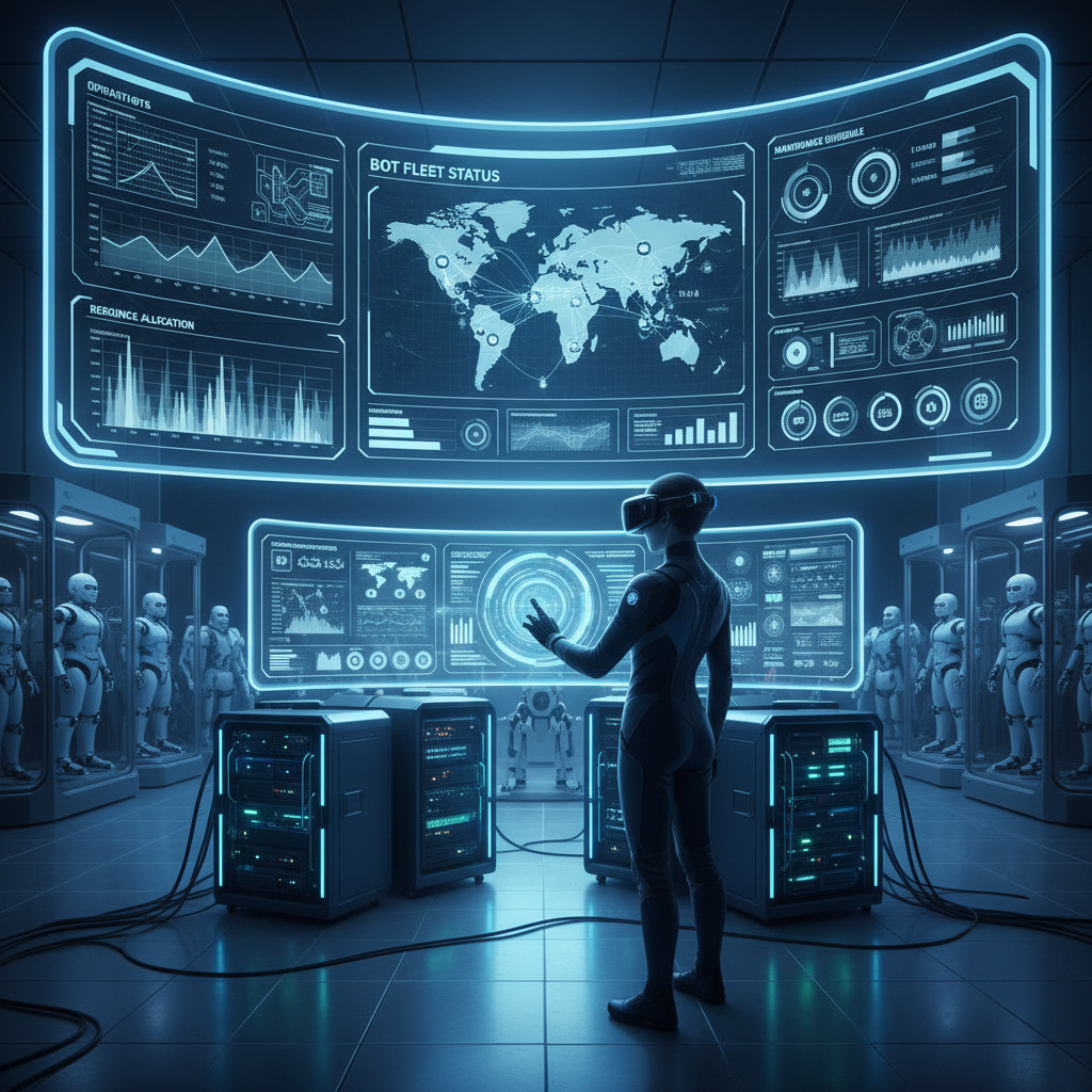 Nowoczesne centrum zarządzania, gdzie boty monitorują i optymalizują pracę innych botów wspierających zarządzanie zespołem