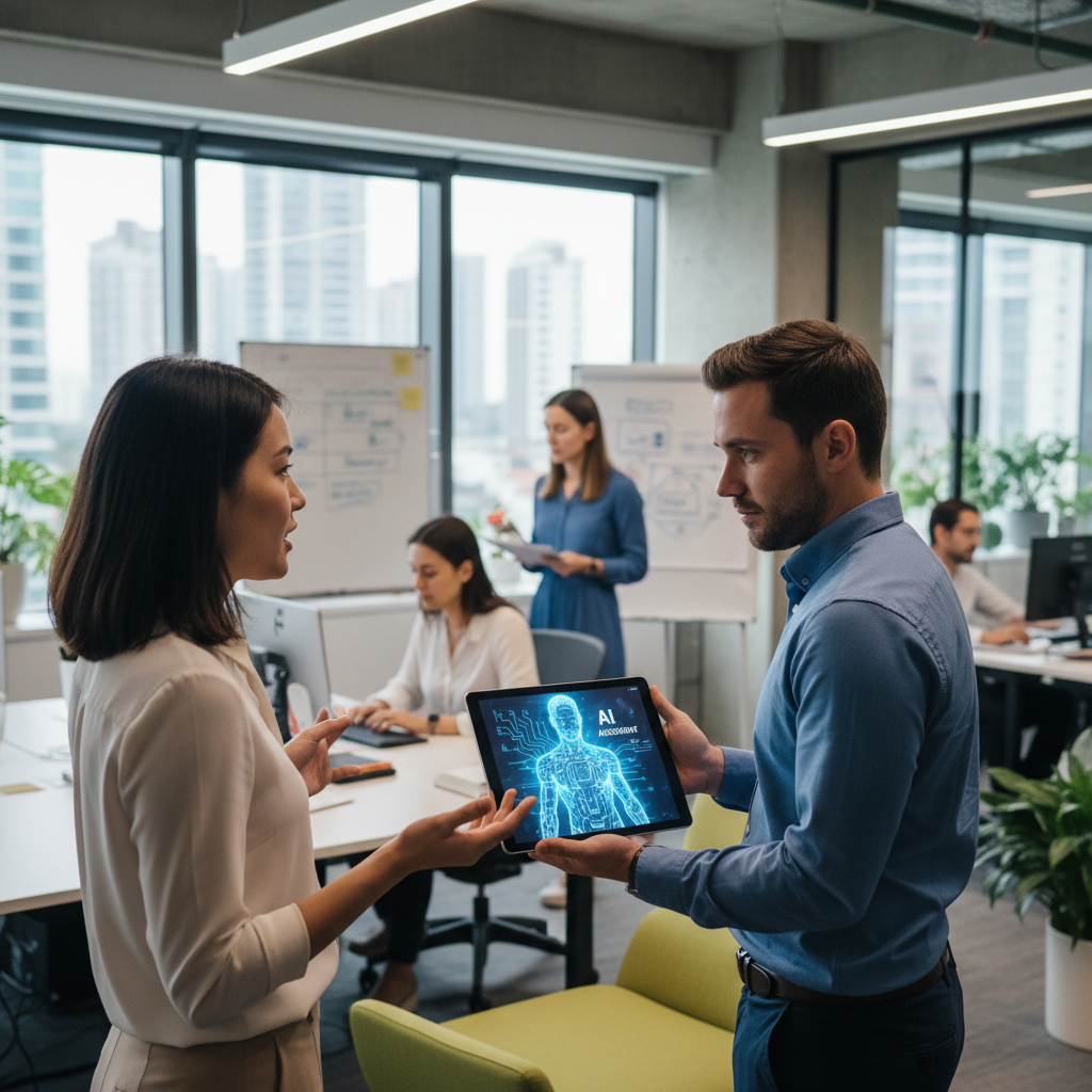 Nowoczesne biuro, gdzie boty wspierające zarządzanie zespołem przejmują rutynowe zadania, a zespół skupia się na kreatywności