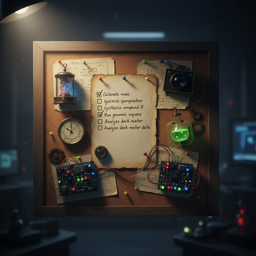 Lista kontrolna skutecznych rozmów o nauce na tle gadżetów naukowych.