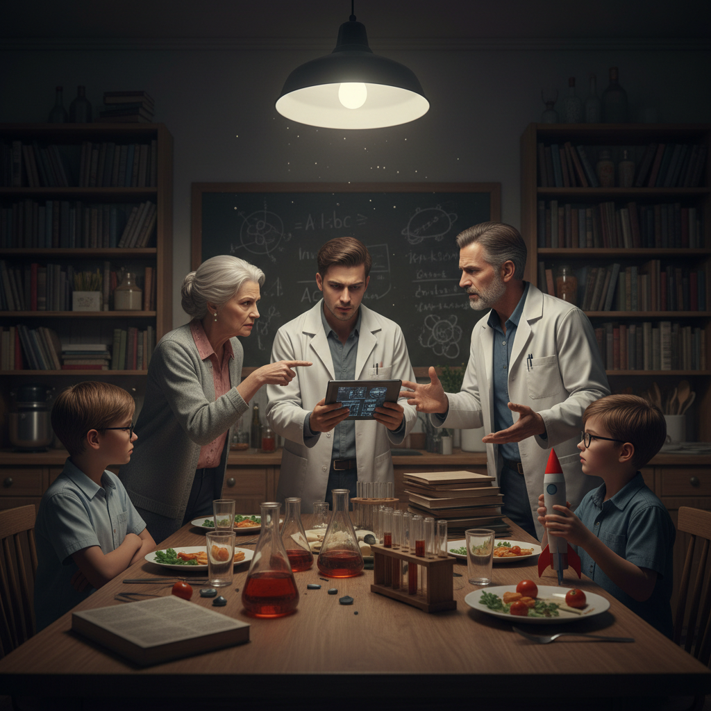 Zdjęcie: Burzliwa rozmowa o nauce przy stole, różne pokolenia.
